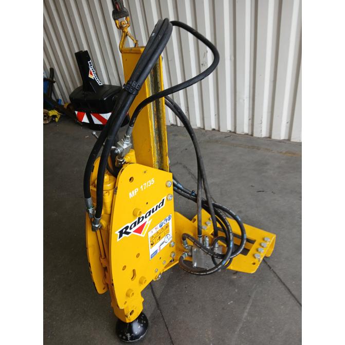 En option il est possible d'ajouter une inclinaison hydraulique de +/- 20°. Cet enfonce-pieux sur mini-pelle a été conçu pour enfoncer des piquets bois ou métal (avec option martyr).
